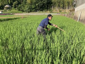 中干しのタイミングで行う田んぼの溝切りは、さっと水を排水して、さっと水を全体に行き渡せるために大事な工程。